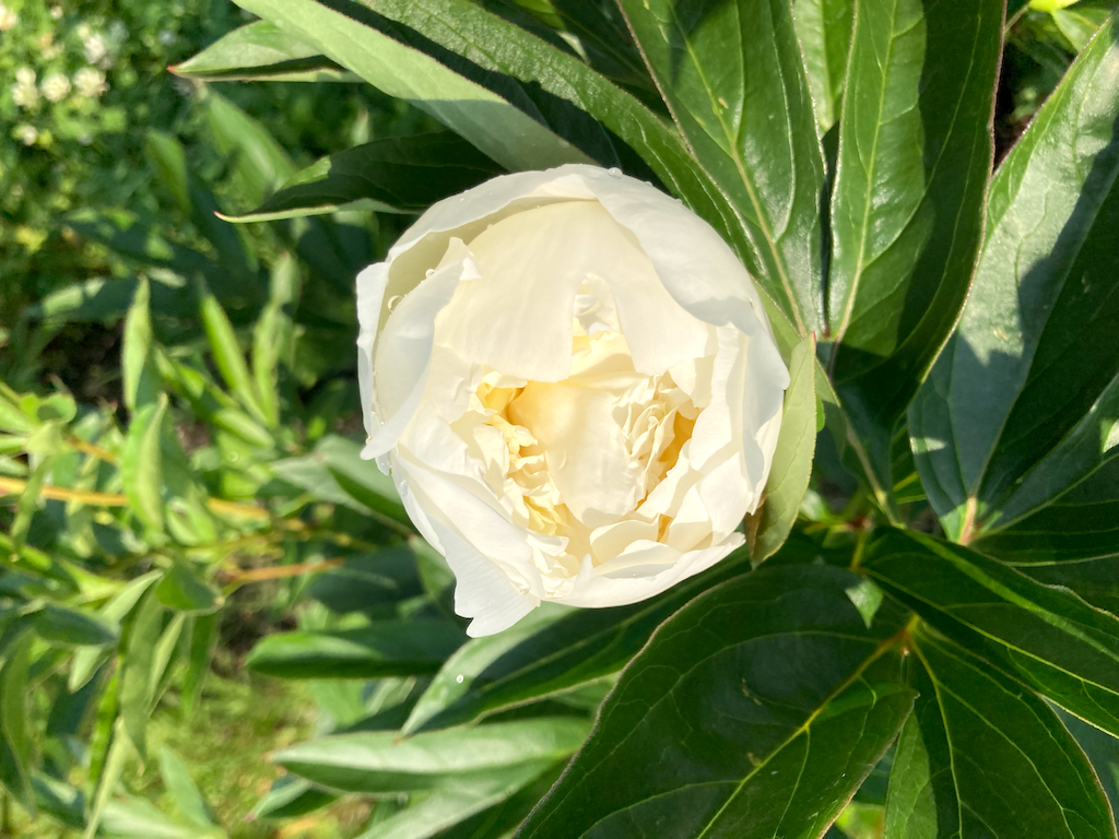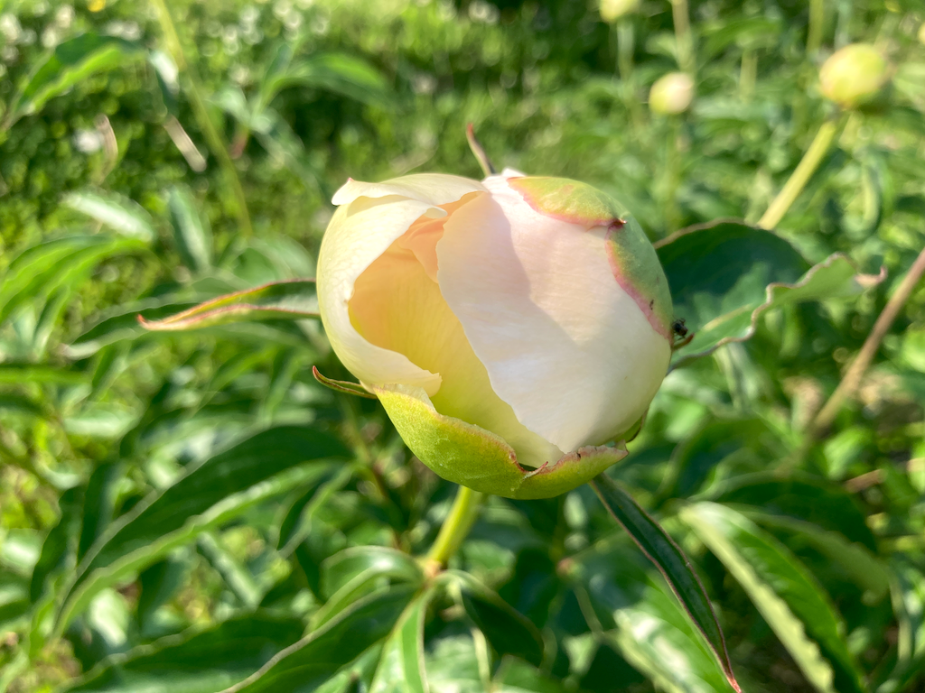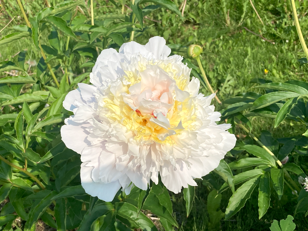 This is one of our most interesting peonies! The gorgeous flowers begin a blush color, and open with yellow accents in the center, once fully open are light blush or pearl white. The full double bloom has a round shape and a wonderful sweet smell. Has strong, tall stems with attractive green foliage.